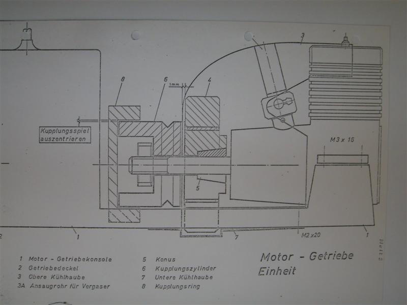 Gussmaterial. Die Kurbelwelle mit Kupplung und Getriebe sind senkrecht