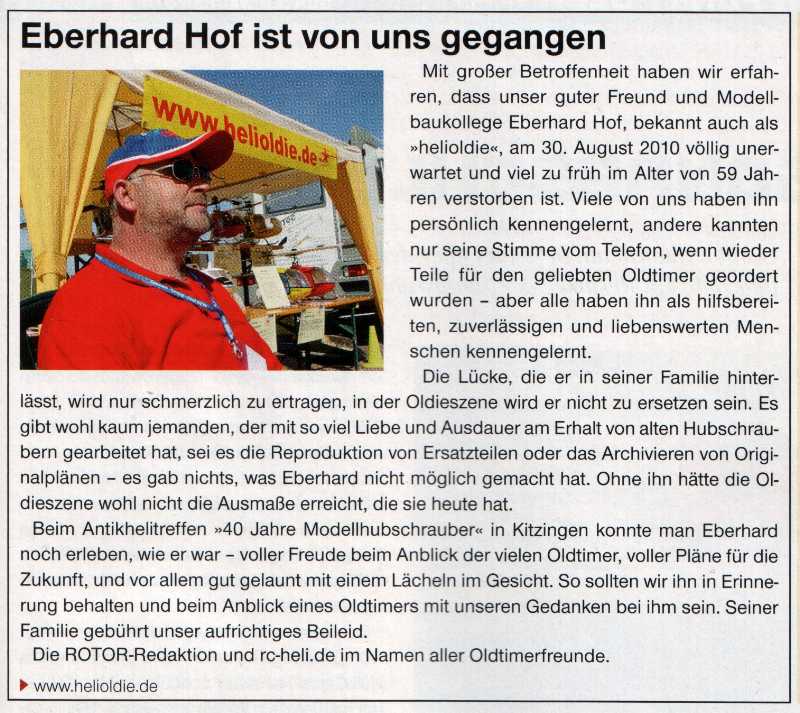 Hier blasen wir mal wieder den Staub von den Mechaniken unserer Heliboys. Normal blicken wir nicht so angestrengt - aber Drehzahl gesteuert ohne Kreisel und Mischer auf dem Heckrotor! Mein Vater Eberhard Hof (Baujahr 1951) war seit seinem 11. Lebensjahr Modellflieger. Seinen ersten Modellhubschrauber baute und flog er 1972. Ich heiße Martin (BJ 1970) und durfte von Anfang an dabei sein. Selbst fliege ich Modelle seit 1978. (alles was irgendwie fliegt) Diese www- Site hat mein Vater geschaffen, damit seine grauen Zellen in Bewegung bleiben und dem einen oder anderen leidgeplagten Helipiloten weitergeholfen werden kann. Vor allem hatte er sich vorgenommen, RC-Helicopter der ersten Stunden nicht aussterben zu lassen, ich kann mich dem nur anschließen. Diese Webseite soll eine Plattform für den Tausch, die Beschaffung und Restauration von Nostalgie -RC- Helicoptern und deren Ersatzteile darstellen. Sie lebt aber nur von der Zusammenarbeit von Sammlern und Piloten der Helioldies. Auf die Idee ist mein Vater auch gekommen, da wir das "Wettrüsten" mit den modernen RC- Helis für unseren Teil zunehmend unnötig gefunden haben. Die fliegerischen Leistungen konnten wir durch modernere Hightech- Elektronikkomponenten und CNC gefräste Mechanikteile auch nicht mehr verbessern. Warnung: Wenn der Heli-Virus einmal richtig zugeschlagen hat, ist er unheilbar. Zu Risiken und Nebenwirkungen fragt euren Arzt oder bessere Hälfte.